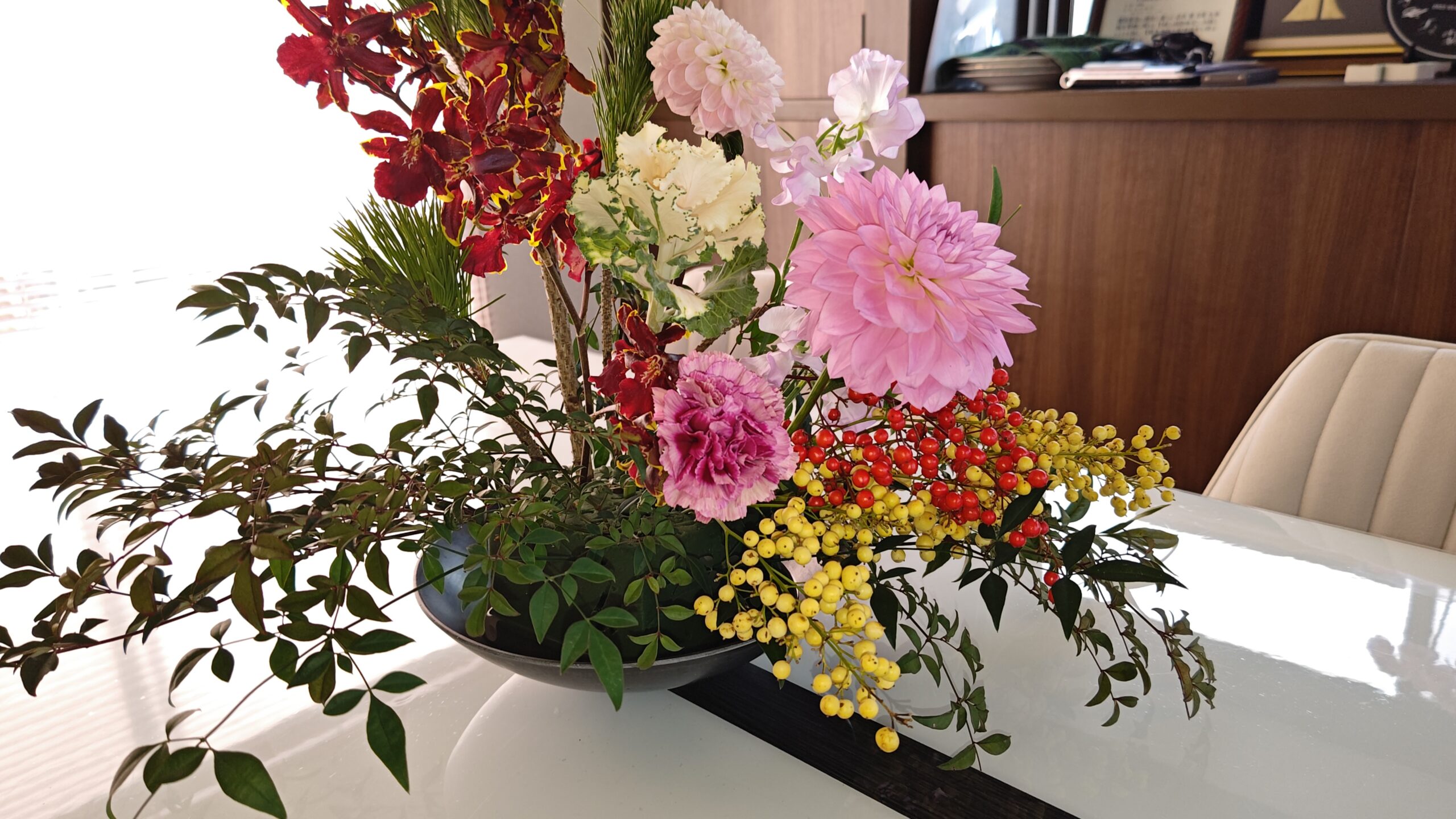 画像はいつもお世話になっている本田土木工業の高山社長が生けたお花。会社におじゃましたときにパチリ、と。